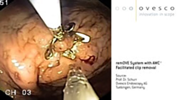 Zeigt die erleichterte Clip-Entfernung mit AWC®. Clip kann während Eingriffs fixiert werden, um bessere Positionierung des DC Cutter zu gewährleisten.