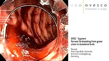 Hämostase einer Forrest Ib Blutung eines großen Ulkus im Bulbus duodeni